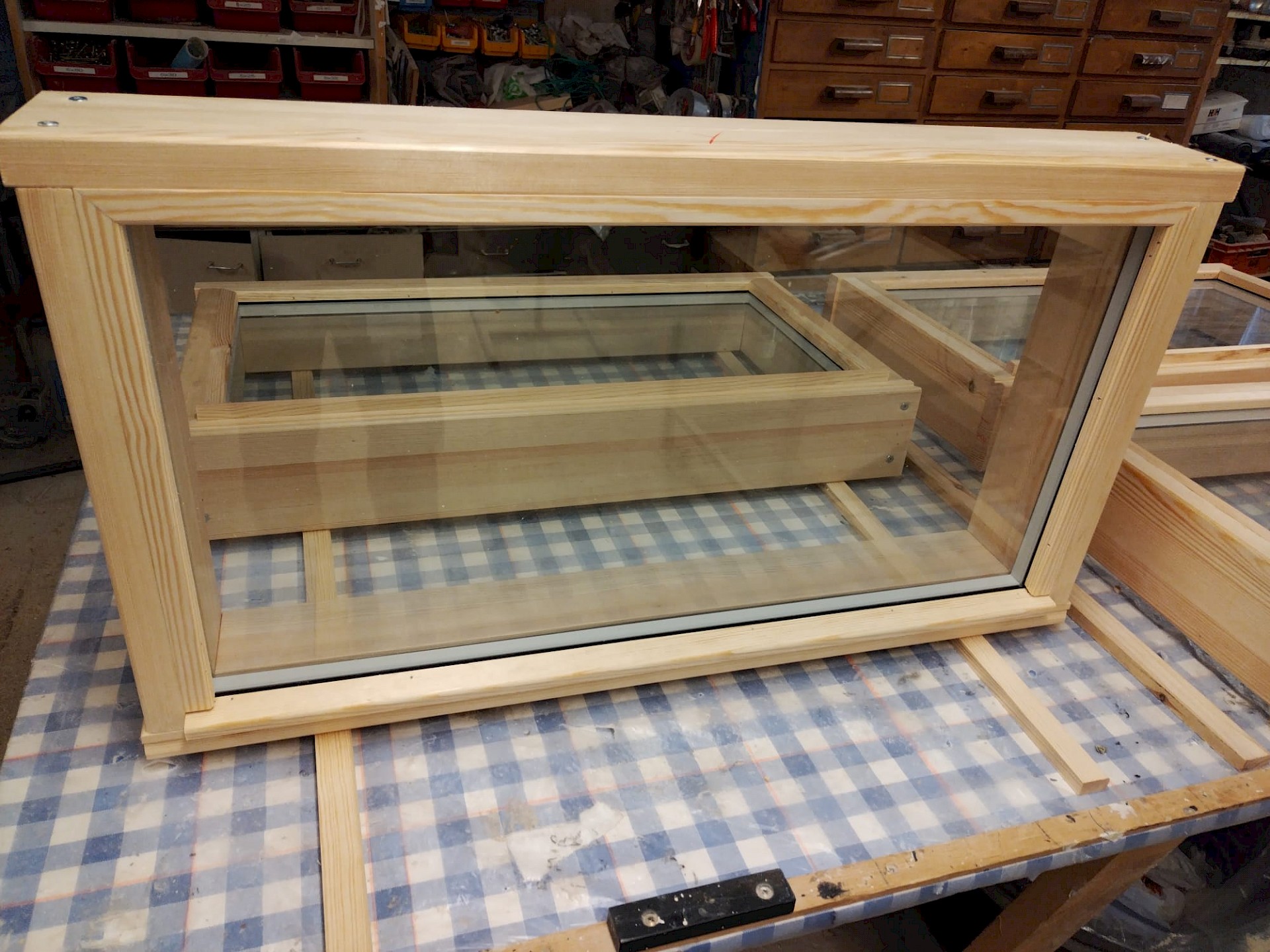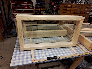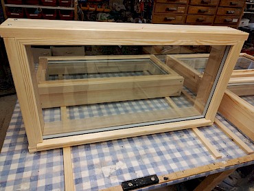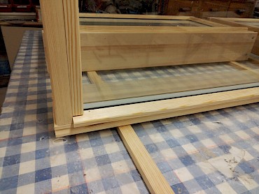 Puuvalmiita ikkunoita ilman pintakäsittelyä.
